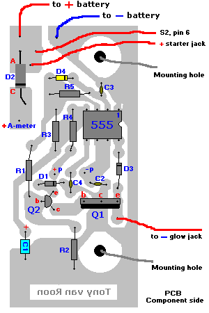 which in turn provides enough current, adjusted with potentiometer P1, to make the plug glow. C2, C3, & C4 are