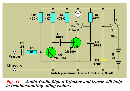 Figure 11 shows how an astable multivibrator can act as a signal injector-tracer for