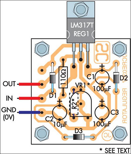 This Adjustable Power Supply comprises a small PC board that utilises a 3-terminal regulator. It does not have too many other components – in fact, there are just three diodes, three capacitors, a resistor and a trimpot to set the output voltage from the regulator. The circuit is based on an LM317T adjustable voltage regulator. D1 provides reverse polarity protection while P1 sets the output voltage.