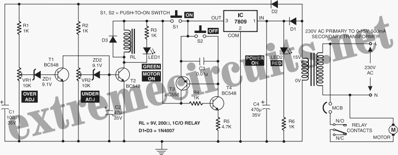 This motor starter protects single-phase motors against voltage fluctuations and overloading. Its salient feature is a soft on/off electronic switch for easy operation. The transformer steps down the AC voltage from 230V to 15V. Diodes D1 and D2 rectify the AC voltage to DC. The unregulated power supply is given to the protection circuit. In the protection circuit, transistor T1 is used to protect the motor from over-voltage. The over-voltage setting is done using preset VR1 such that T1 conducts when voltages goes beyond upper limit (say, 260V). When T1 conducts, it switches off T2. Transistor T2 works as the under-voltage protector. The under-voltage setting is done with the help of preset VR2 such that T2 stops conducting when voltage is below lower limit (say, 180V). Zener diodes ZD1 and ZD2 provide base bias to transistors T1 and T2, respectively. Transistors T3 and T4 are connected back to back to form an SCR configuration, which behaves as an ‘on’/‘off’ control.