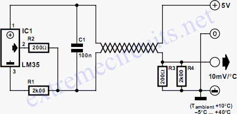 The Type LM35 temperature sensor from National Semiconductor is very popular for two reasons: it produces an output voltage that is directly proportional to the measured temperature in degrees Celsius, and it enables temperatures below zero to be measured. A drawback of the device is, however, that in its standard application circuit it needs to be connected to the actual measuring circuit via a three-wire link. This drawback is neatly negated by the present circuit. When the LM35 is connected as shown, a two-wire link for the measurement range of –5 °C to +40 °C becomes possible.