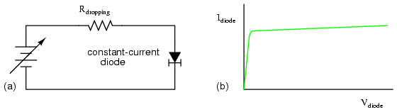 One application for a constant-current diode is to automatically limit current through an LED or laser diode over a wide range of power supply voltages as in Figure below.