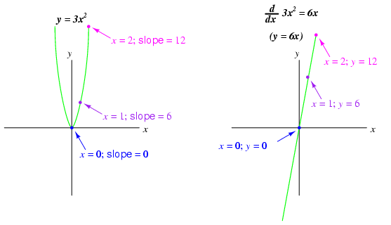 Nonlinear functions such as y = 3x2 may also be differentiated by symbolic means. In this case, the derivative of y = 3x2 with respect to x is 6x: