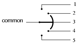 The selector switch shown above switches a common contact lever to one of five different positions, to contact wires numbered 1 through 5. The most common configuration of a multi-position switch like this is one where the contact with one position is broken before the contact with the next position is made. This configuration is called break-before-make. To give an example, if the switch were set at position number 3 and slowly turned clockwise, the contact lever would move off of the number 3 position, opening that circuit, move to a position between number 3 and number 4 (both circuit paths open), and then touch position number 4, closing that circuit.