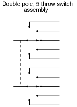 If two identical single-pole, five-throw switches were mechanically ganged together so that they were actuated by the same mechanism, the whole assembly would be called a "double-pole, five-throw" switch: