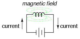 An electric current through a conductor will produce a magnetic field at right angles to the direction of electron flow. If that conductor is wrapped into a coil shape, the magnetic field produced will be oriented along the length of the coil. The greater the current, the greater the strength of the magnetic field, all other factors being equal: