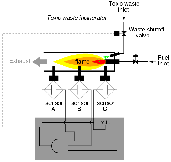 While this design strategy maximizes safety, it makes the system very susceptible to sensor failures of the opposite kind. Suppose that one of the three sensors were to fail in such a way that it indicated no flame when there really was a good flame in the incinerator's combustion chamber. That single failure would shut off the waste valve unnecessarily, resulting in lost production time and wasted fuel (feeding a fire that wasn't being used to incinerate waste).