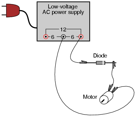 Connect the motor to the low-voltage AC power supply through the rectifying diode as shown. The diode only allows current to pass through during one half-cycle of a full positive-and-negative cycle of power supply voltage, eliminating one half-cycle from ever reaching the motor. As a result, the motor only "sees" current in one direction, albeit a pulsating current, allowing it to spin in one direction.