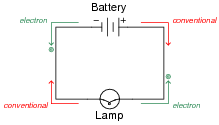 Label the directions of both electron flow and conventional flow in this simple circuit: