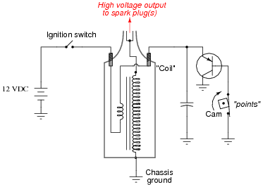 Shown here is the schematic diagram for a simple automotive ignition system, to produce pulses of high voltage sufficient to energize spark plugs in an engine: